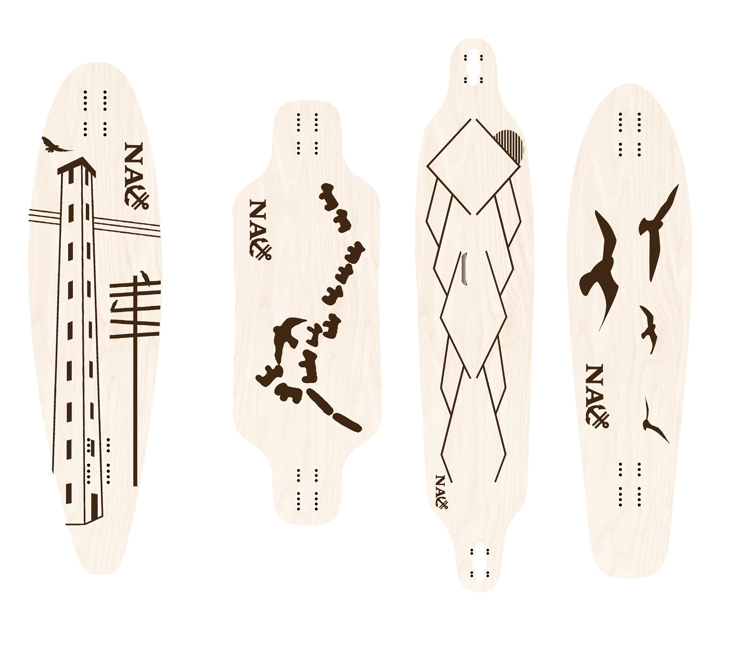 We make every deck ourselves using wood we harvest and mill ourselves. Original shapes. Simple graphics. Made just for you.